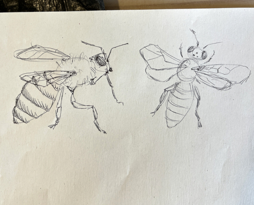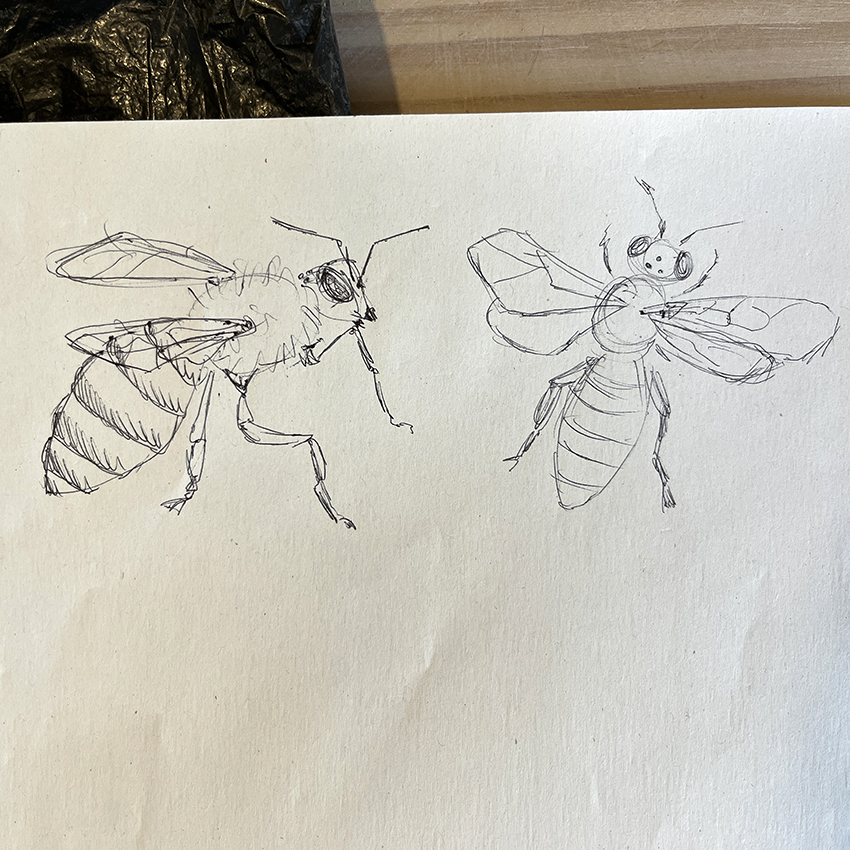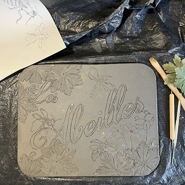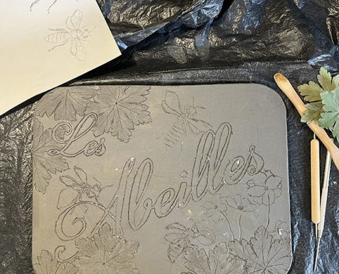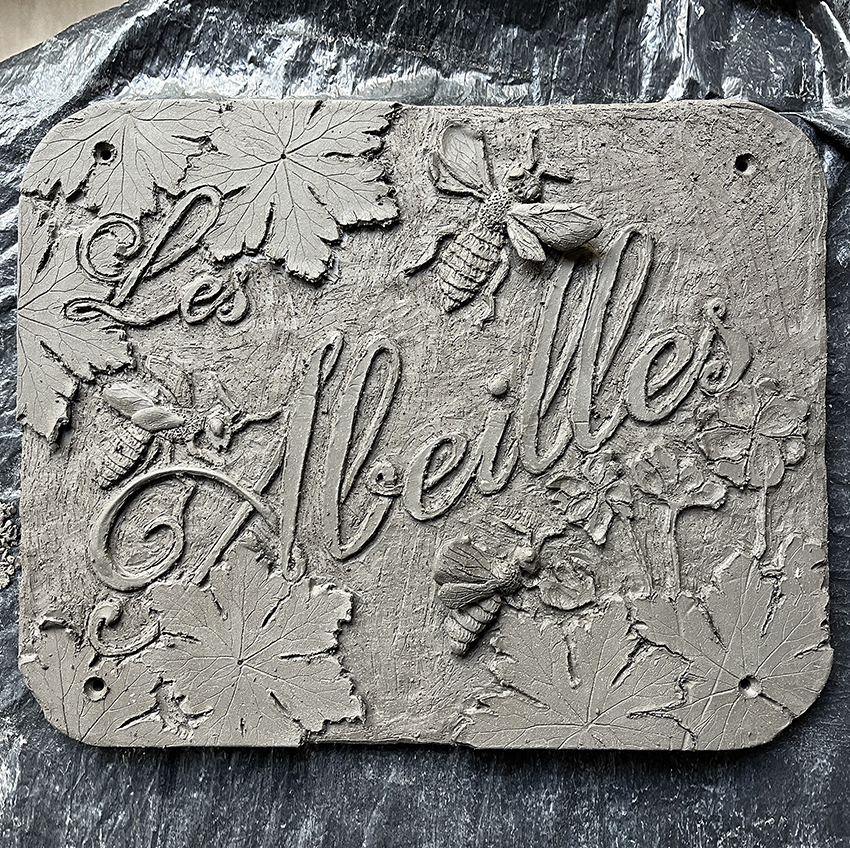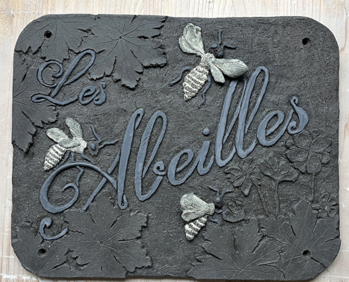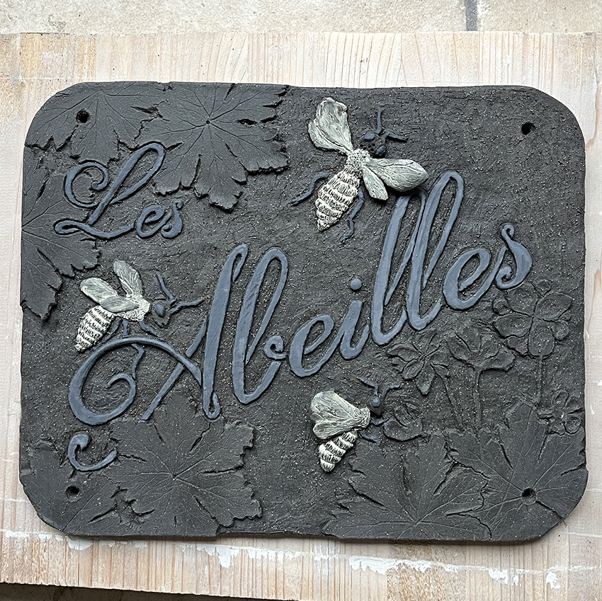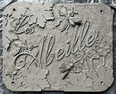 Les Abeilles est une plaque en grès émaillée. La réflexion commence par le choix et la composition typographique (mon premier métier !). Puis un travail d’empreinte dans la terre encore fraîche est fait autour de cette première trace avec les feuilles de végétaux. S’en suit le travail en creux du bas-relief mais aussi en modelage pour les abeilles. Les différentes couleurs d’émaux sont issues de mes recherches personnelles.