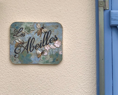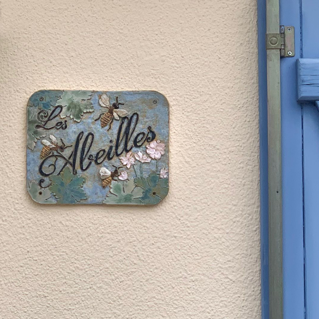 Villa des Chênes est une plaque en grès émaillée. La réflexion commence par le choix et la composition typographique (mon premier métier !). Puis un travail d’empreinte dans la terre encore fraîche est fait autour de cette première trace avec les feuilles des arbres de la propriété. S’en suit le travail de bas-relief (que j’adore faire). Les différentes couleurs d’émaux sont issues de mes recherches personnelles.